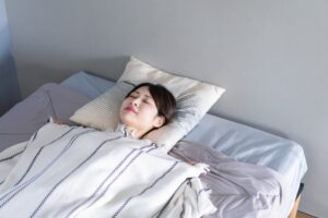 横向き寝(側臥位)の徹底: 仰向けで寝ると重力で舌が落ち込みやすいため、